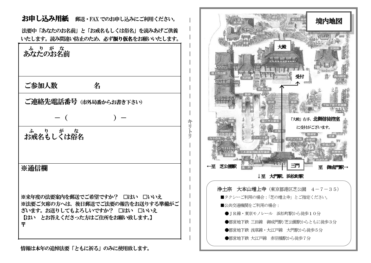 ※当日会場にいらっしゃれない方でも、申込者のお名前、故人のお戒名(もしくは俗名)をお知らせ頂ければ、法要中にお名前をお読み上げし、ご供養致します。