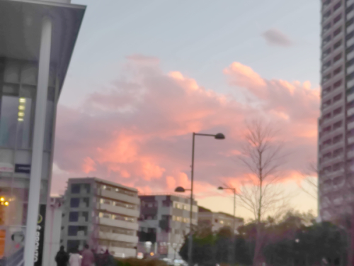 外を歩いて風景の写真を撮ることも増えました。ズームしたらピンボケてしまったのですが、夕焼けに照らされた雲がとても美しかったのでお届けします。
