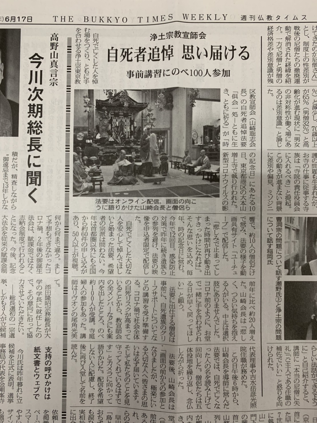 また、仏教タイムズ様より、6月17日の紙面にて、自死者追悼法要を記事にしていただきました。